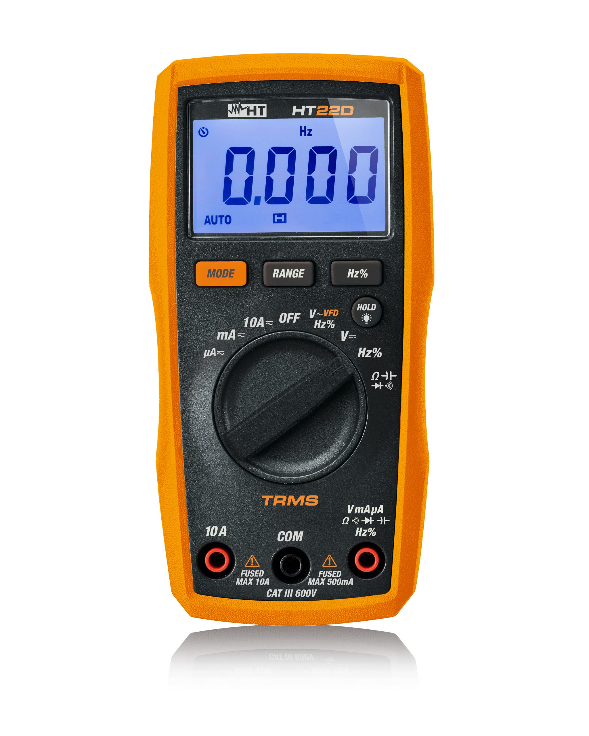 Das HT22D verfügt über eine innovative VFD-Funktion (Variable Frequency Driver) für genaue Messungen der Wechselspannung, auch am Ausgang von Frequenzumrichtern. Weiterhin verfügt das HT22D über eine Data HOLD-Funktion, ein großes hintergrundbeleuchtetes Display (4 dgt, 4000 Punkte) und eine Auto Power OFF-Funktion für die automatische Abschaltung bei Inaktivität.