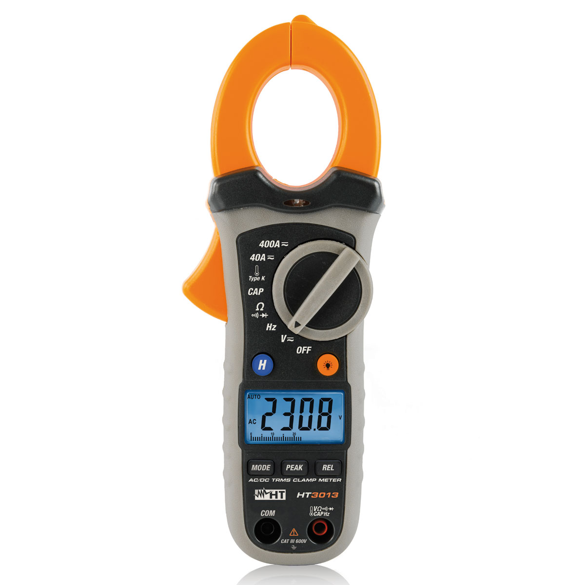 Die Stromzange HT3013 kann AC/DC-Ströme bis 400 A und AC/DC-Spannungen bis 600 V, Widerstand, Frequenz, Kapazität, Tastverhältnis, Temperatur mit Sonden vom Typ K, Durchgangs- und Diodenprüfung messen.
