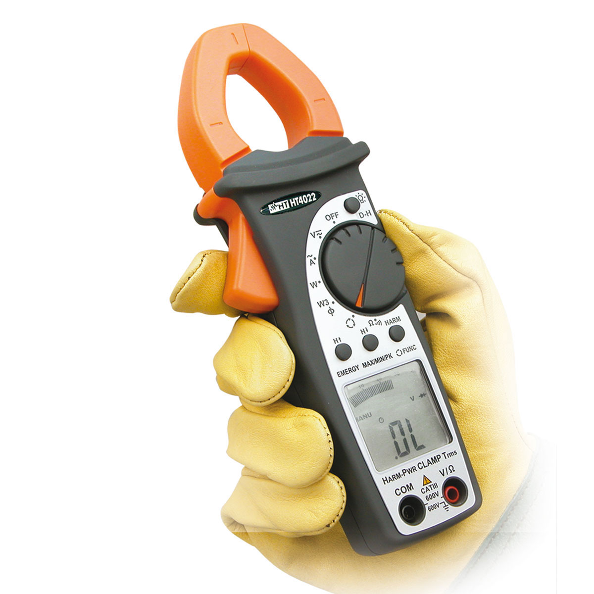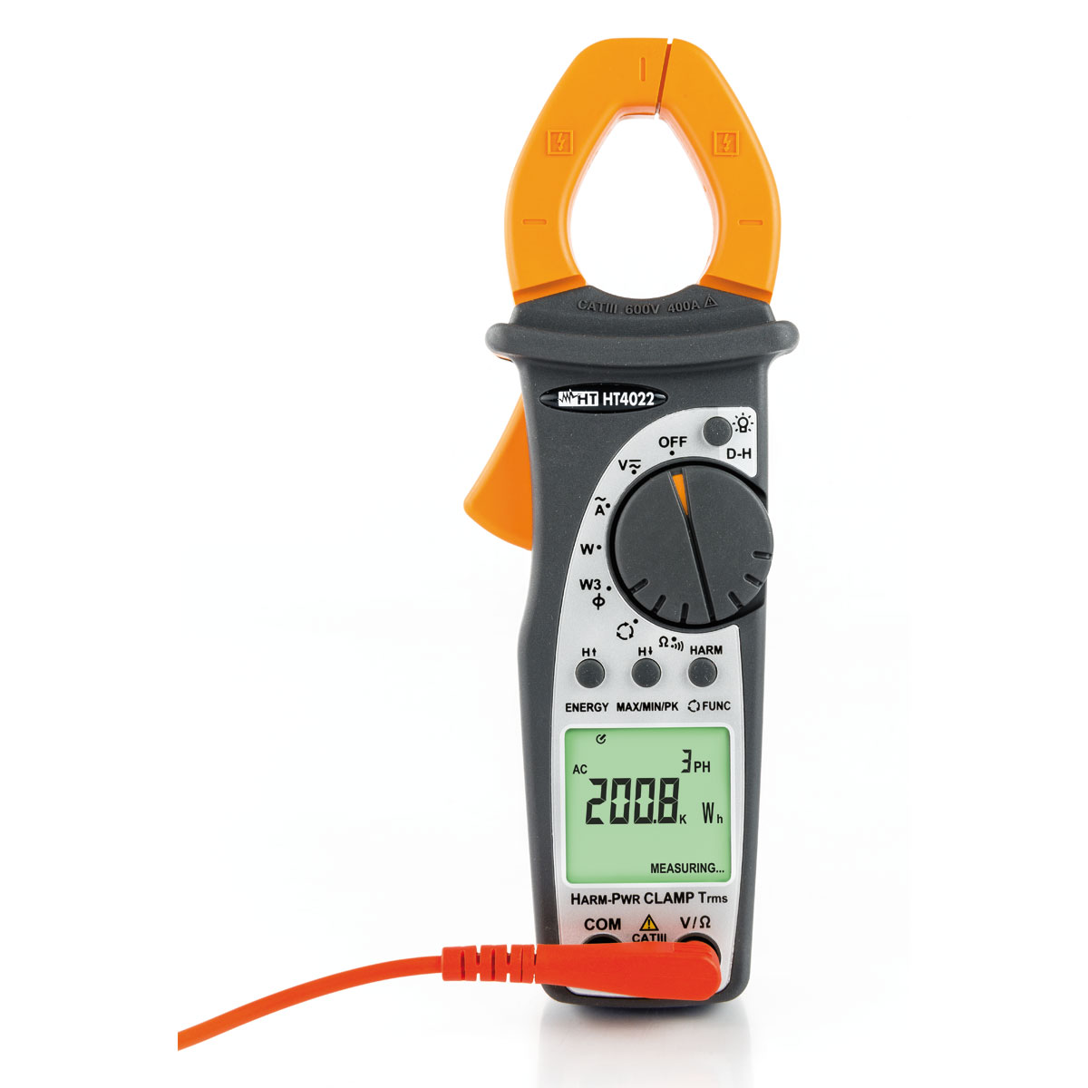 Die innovative, komplett ausgestattete Amperemeterzange HT4022 misst mit Echt- Effektivwert (TRMS) auf AC-Strom bis 400 A , AC/DC-Spannung, Frequenz, Widerstand und Durchgangsprüfung sowie Wirk-, Blind, Scheinleistung, Cos und Energie und Harmonische von Spannung und Strom bis zur 25. Oberwelle und THD% für Ein oder symmetrische Dreileiter-Dreiphasensysteme.