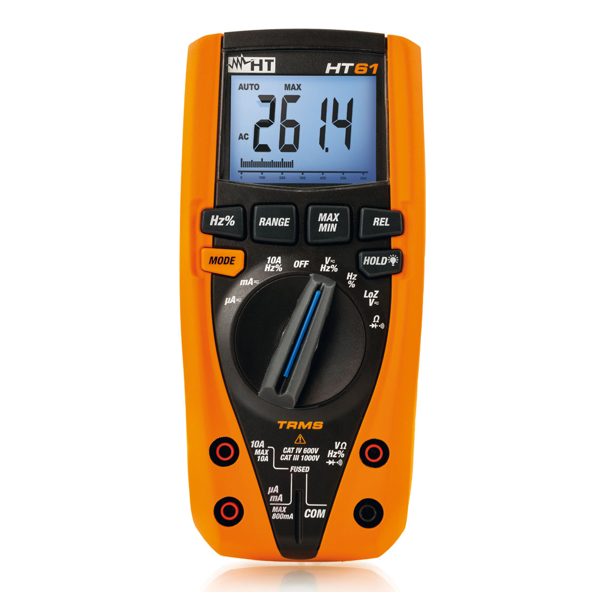 Bei unserem neuen professionellen Multimeter HT61 handelt es sich um ein präzises TrueRMS Multimeter, zugelassen für Messungen in der Überspannungskategorie CAT IV 600 V bzw. CAT III 1000 V. Dieses Multimeter ist mit einem äusserst robusten Gehäuse sowie einer großen, klar ablesbaren Anzeige ausgestattet und bietet weiterhin eine Vielzahl von Multimeter-Messfunktionen mit einem weiten Messbereich an. Die einfache Handhabung ermöglicht eine präzise Durchführung der Messaufgaben auch unter extremen Umgebungsbedingungen.