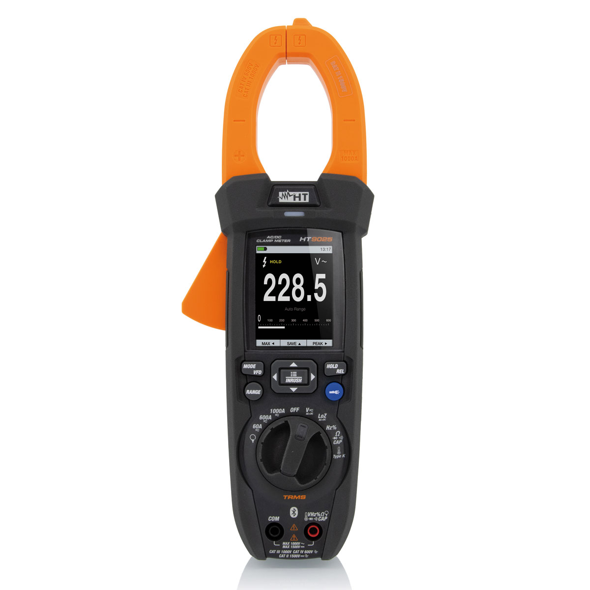 Die professionelle TRMS Stromzange HT9025 verfügt über eine große, hochauflösende LCD Anzeige und ermöglicht durch eine Vielzahl von Multimeter-Messfunktionen mit einem weiten Messbereich (DC Spannung bis 1500 V !) die Messung von allen relevanten Parametern einer elektrischen Installation.