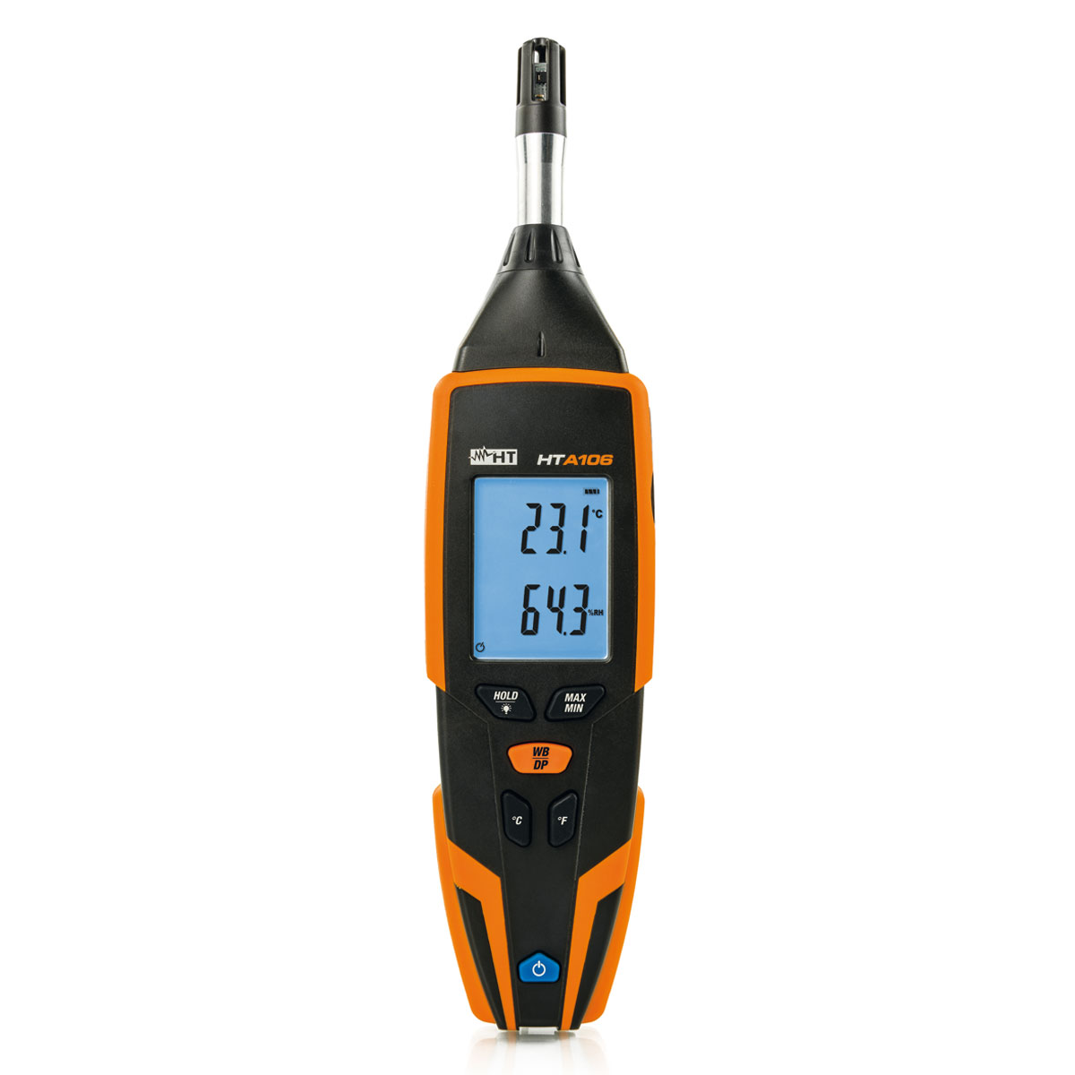 Das HTA106 misst Lufttemperatur, Luftfeuchtigkeit und den Taupunkt mit einem integrierten Sensor. Es ist mit einer Hintergrundbeleuchtung ausgestattet, um das Ablesen in schlecht beleuchteten Umgebungen zu erleichtern.