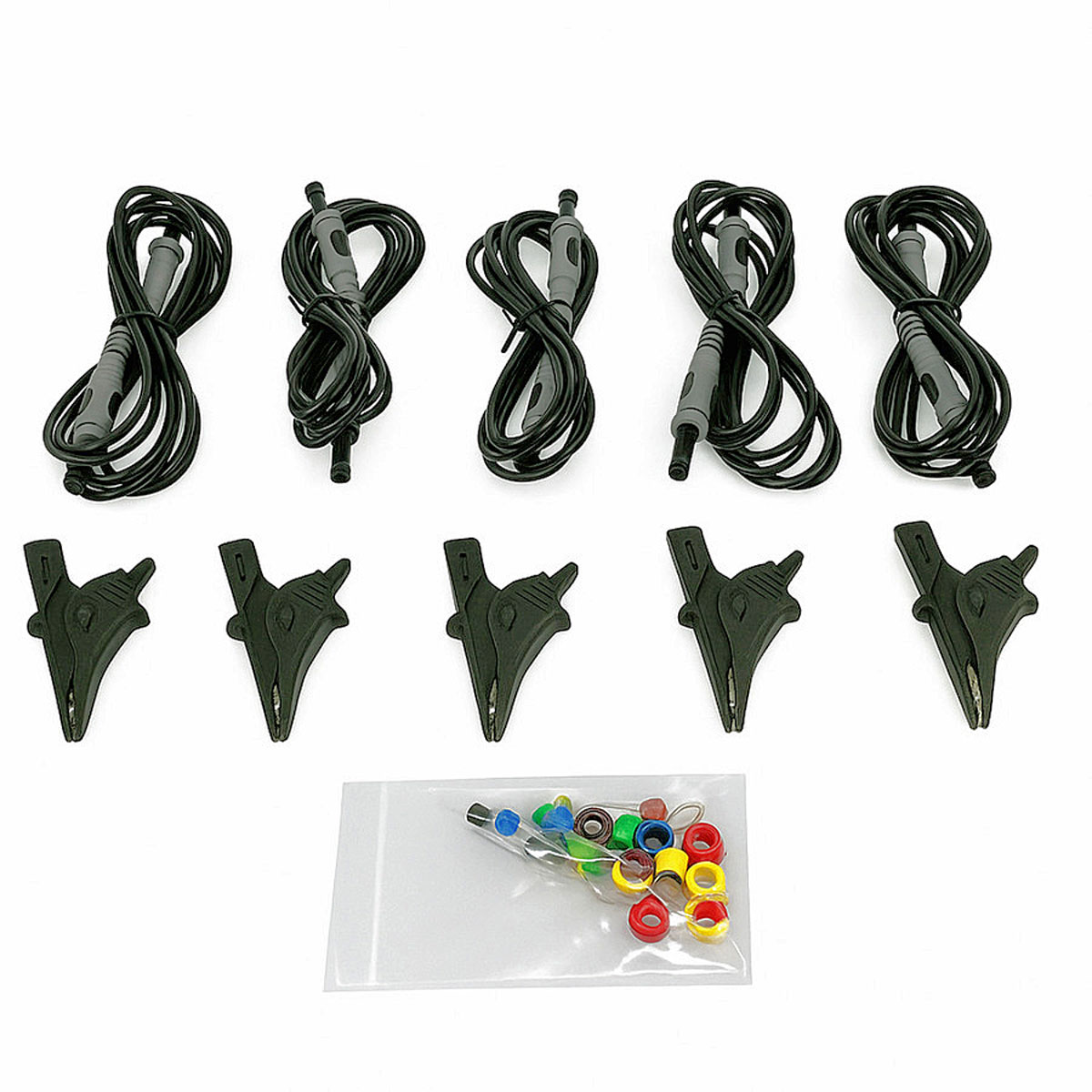 Messleitungsset (CAT III 1500 V / CAT IV 1000 V / max. 10 A) bestehend aus 5 schwarzen Messleitungen je 2 m & 5 schwarzen Krokodilklemmen sowie je 4 Kennzeichnungsringe in 8 Farben (Rot, Grün, Gelb, Blau, Grau, Braun, Weiß, Schwarz).