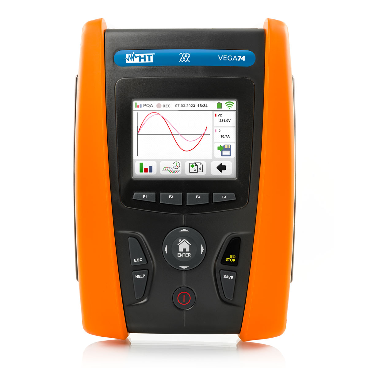 Der Energie- und Netzanalysator VEGA74 misst elektrische Größen in Gleichstromnetzen sowie in Ein- und Dreiphasen-Wechselstromnetzen beliebiger Belastung. Acht isolierte Messkanäle (4x Spannung + 4x Strom) ermöglichen die gleichzeitige Messung der Phasen- und Neutralleiterspannungen und -ströme. Das breite Einsatzgebiet erstreckt sich von der Erfassung, Darstellung und Aufzeichnung von Netzparametern über die Registrierung und Analyse der Leistung und des Energieverbrauchs. Bis zu 600 Messparameter können gleichzeitig aufgezeichnet werden. Durch seine kompakte Bauform und seinen robusten Aufbau ist das VEGA74 nicht nur für den stationären Betrieb, sondern auch für den mobilen Einsatz geeignet. Während Spannungsausfällen übernimmt der eingebaute Akku für bis zu 6 Stunden die Versorgung des Messgerätes.